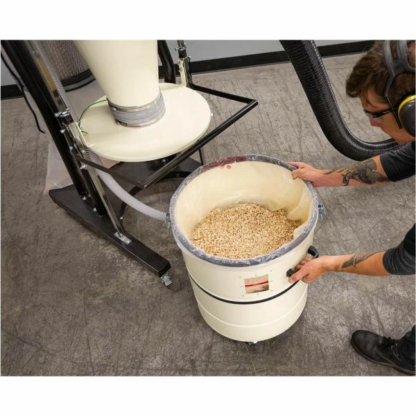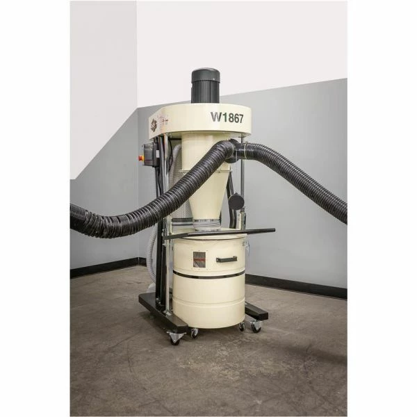This Cyclone Dust Collector provides the efficiency of a 2-stage cyclone system with the portability of a single-stage dust collector. Features include high surface area pleated filters with paddles to mechanically knock off dust cake, remotely controlled magnetic switches, easy lid lifting levers for emptying collection drums, and a compact design for moving around the shop. Three models are available to suit most dust collection needs.